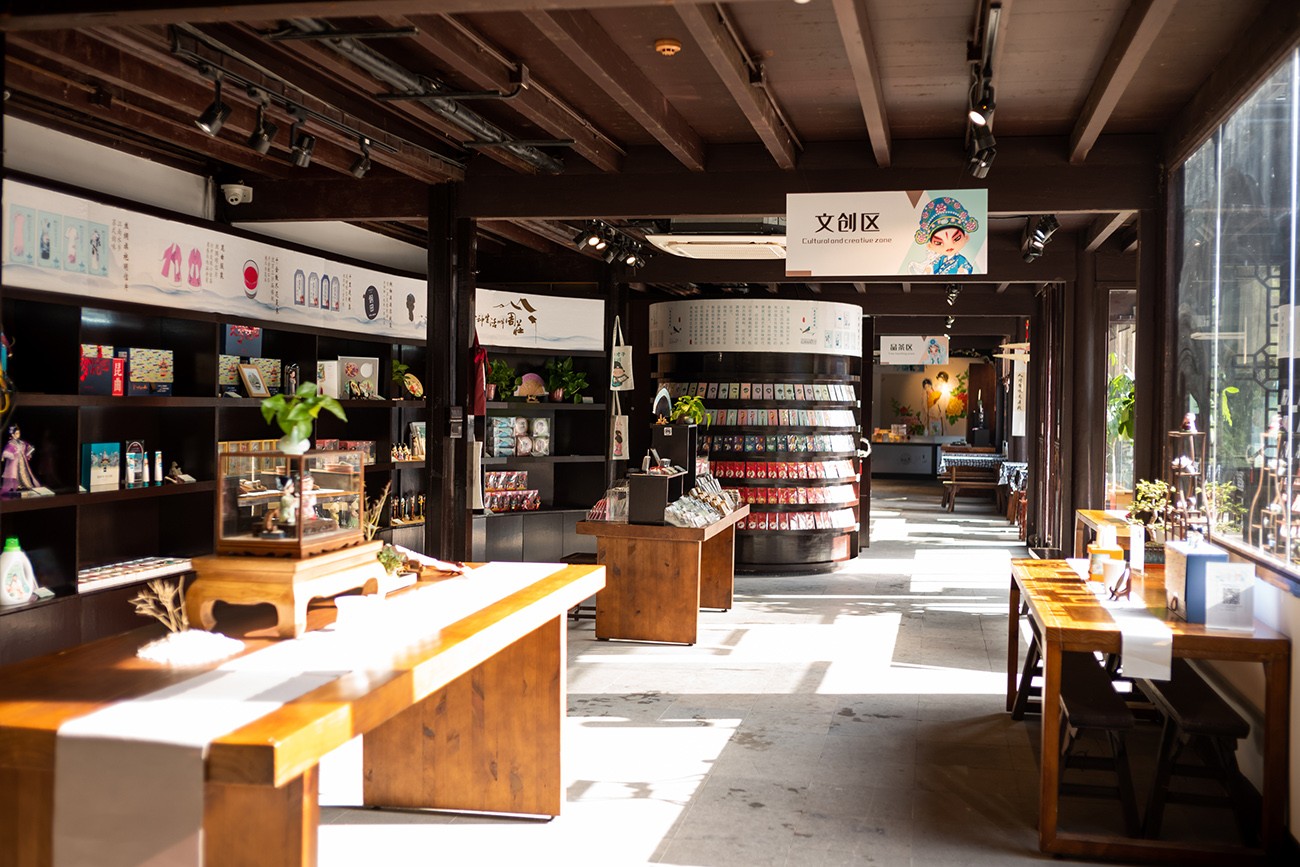 This cultural and creative store offers a variety of Jiangnan water town style products, including tea cups, embroidery, Kunqu opera and Zhouzhuang stoves.