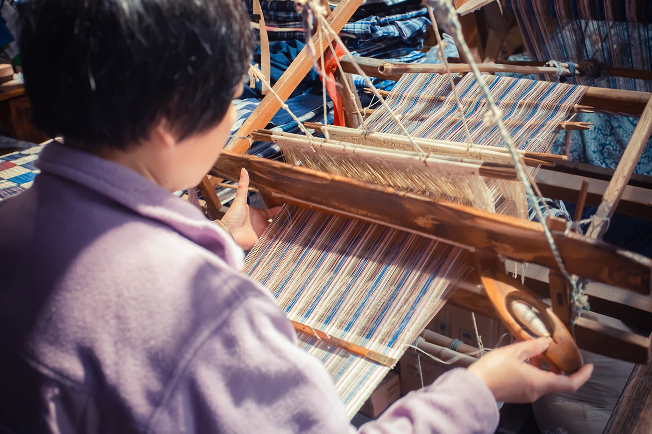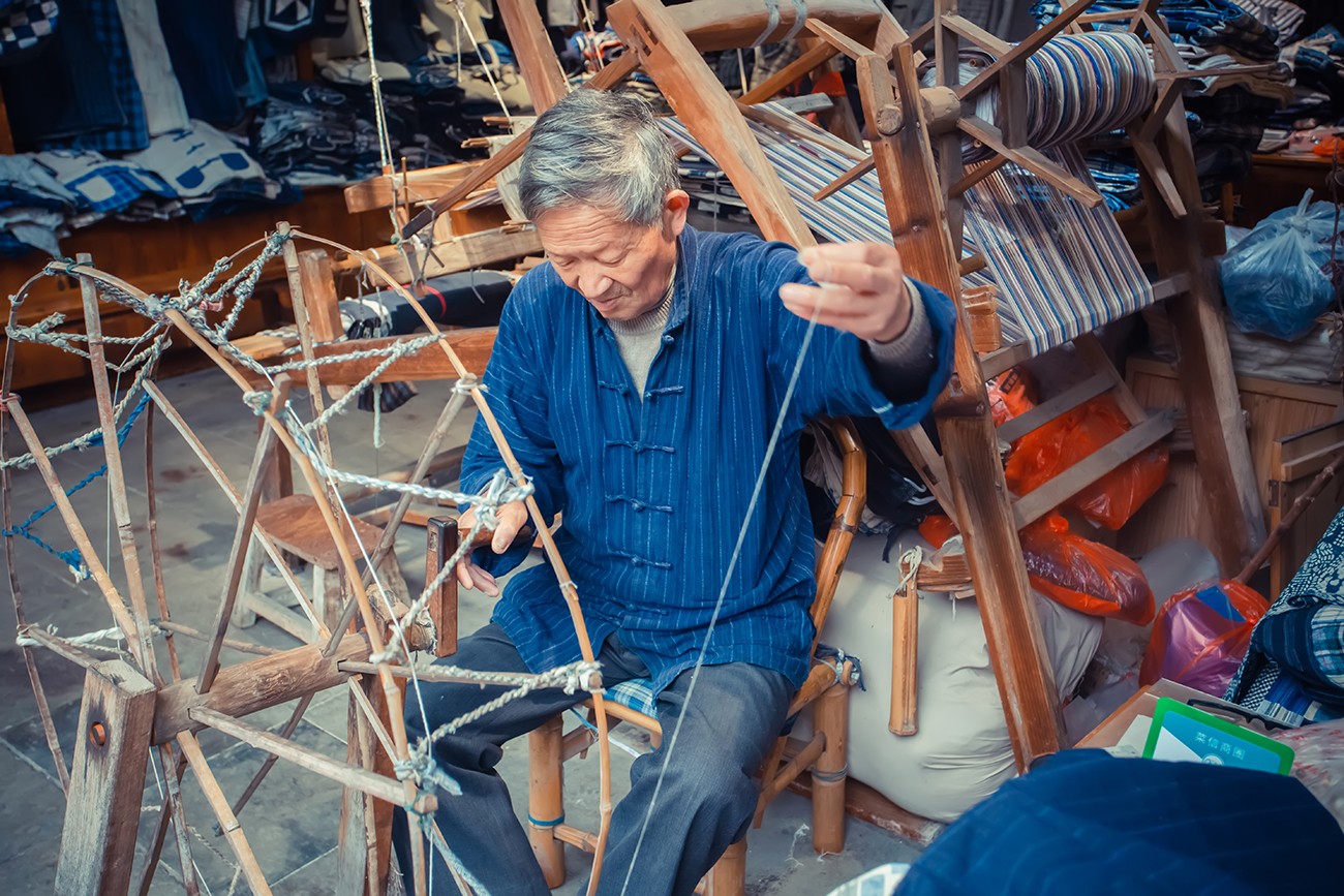 Traditional homespun is produced by utilizing a series of tools including the spinning loom, shuttle, baffle, pedal, rope, and roller, to undertake the twisting, spinning, and cutting processes.